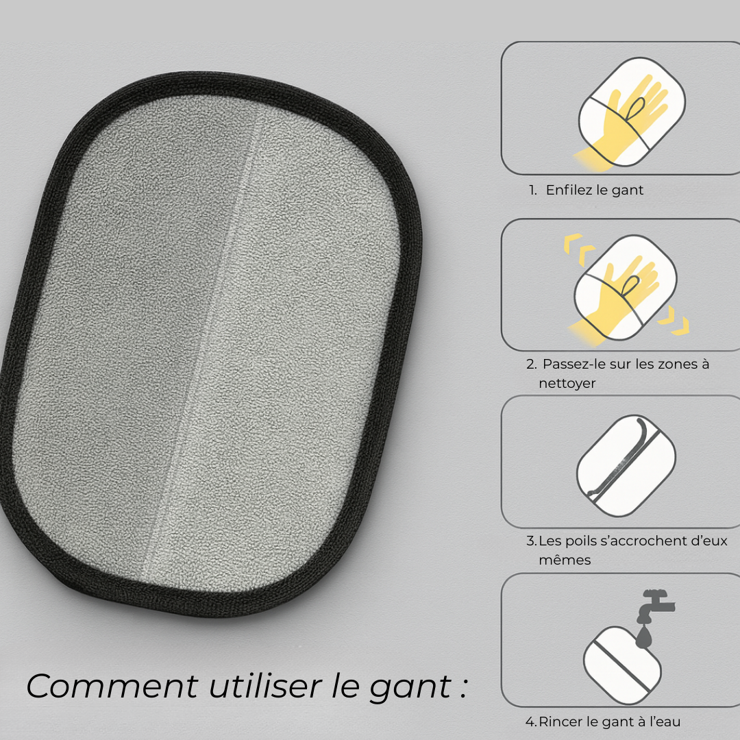 En frottant légèrement la surface, la fibre électrostatique du gant attire automatiquement les poils sans effort.